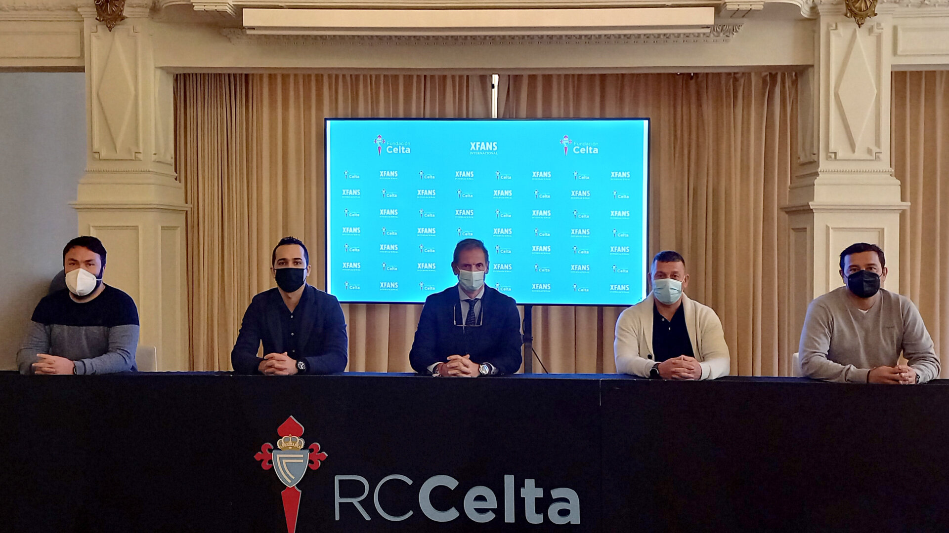 Na imaxe, de esquerda a dereita: Marcos Alonso (Fundación Celta), Delcio Roberto Pires (Xeral ManagXFans), Germán Arteta (Fundación Celta), Marcos Trueba (XFans) e Diego Sarabia (Fundación Celta).