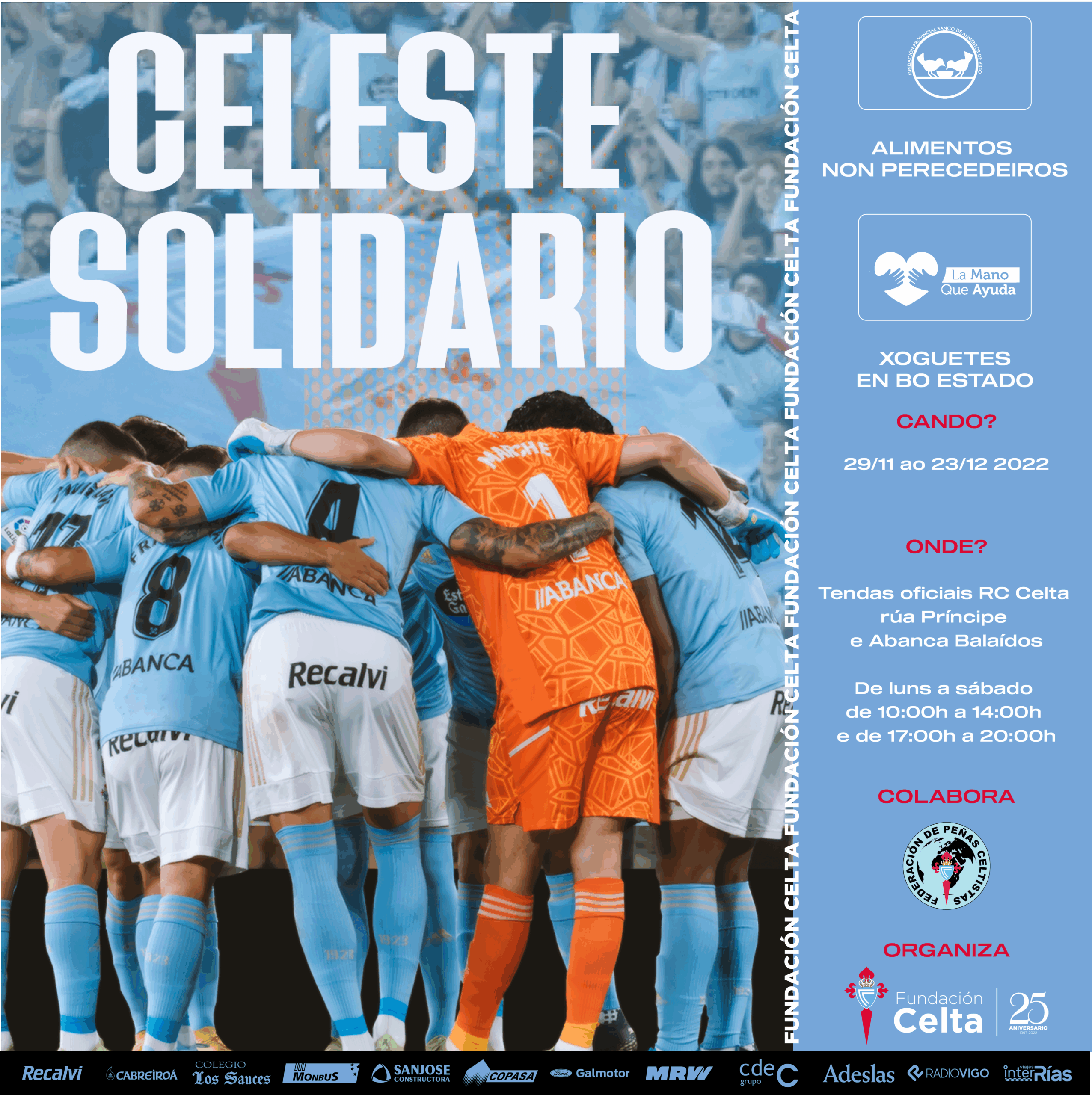 A Fundación Celta organiza, como cada Nadal, a campaña de recollida de xoguetes e alimentos ‘Celeste Solidario’, que este ano terá como destinatarias ás organizacións ‘La mano que ayuda’ e a ‘Fundación Banco de alimentos de Vigo’. O principal obxectivo desta campaña é o de mobilizar á afección para que achegue o seu granito de area na axuda a aqueles que máis o necesitan.