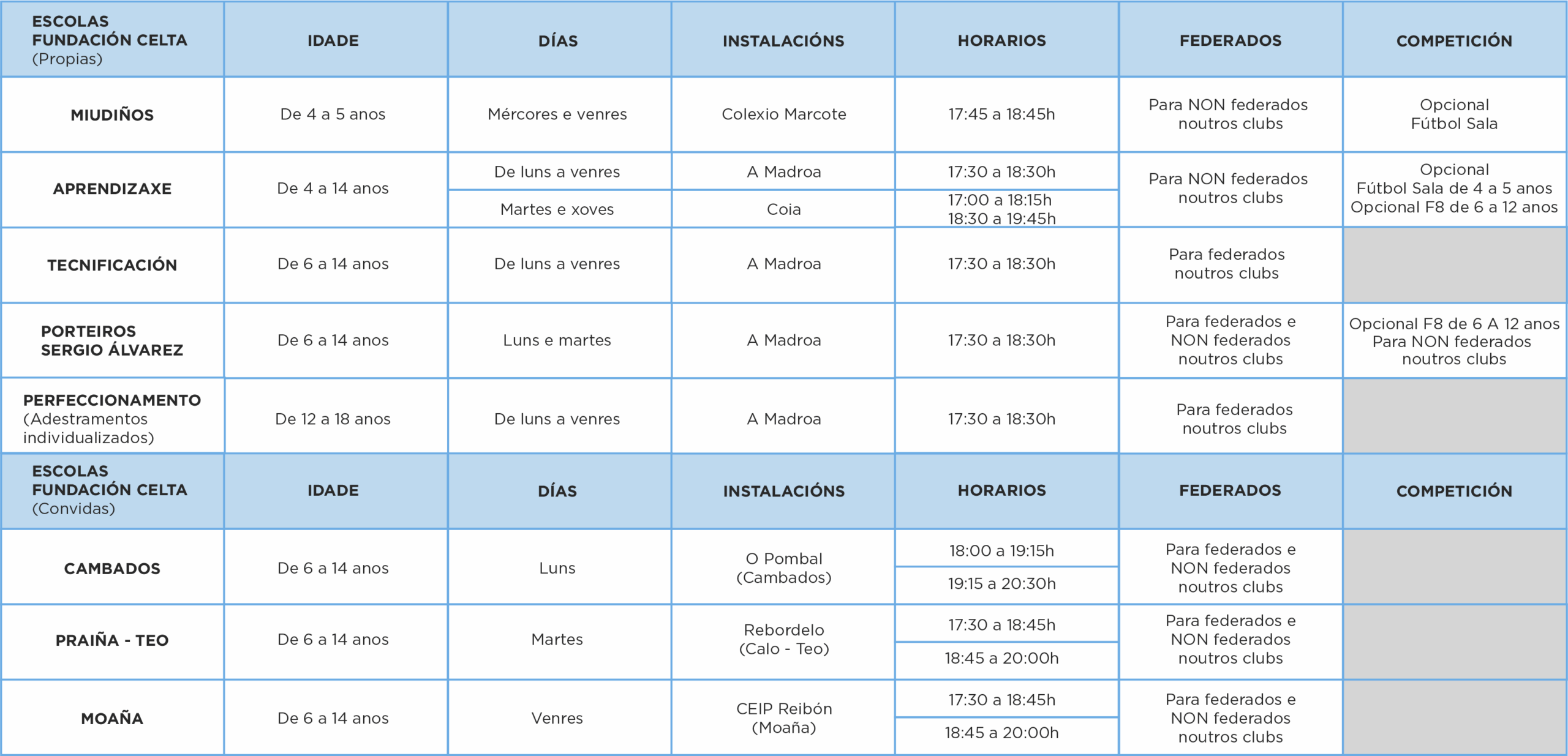A partir do mes de SETEMBRO poñerase en marcha unha nova tempada das ESCOLAS DE FÚTBOL FUNDACION CELTA con diferentes tipos de Escolas e en diferentes Sedes repartidas por toda a xeografía galega, para que todos os novos futbolistas teñan a oportunidade de formarse futbolísticamente da man do RC Celta.