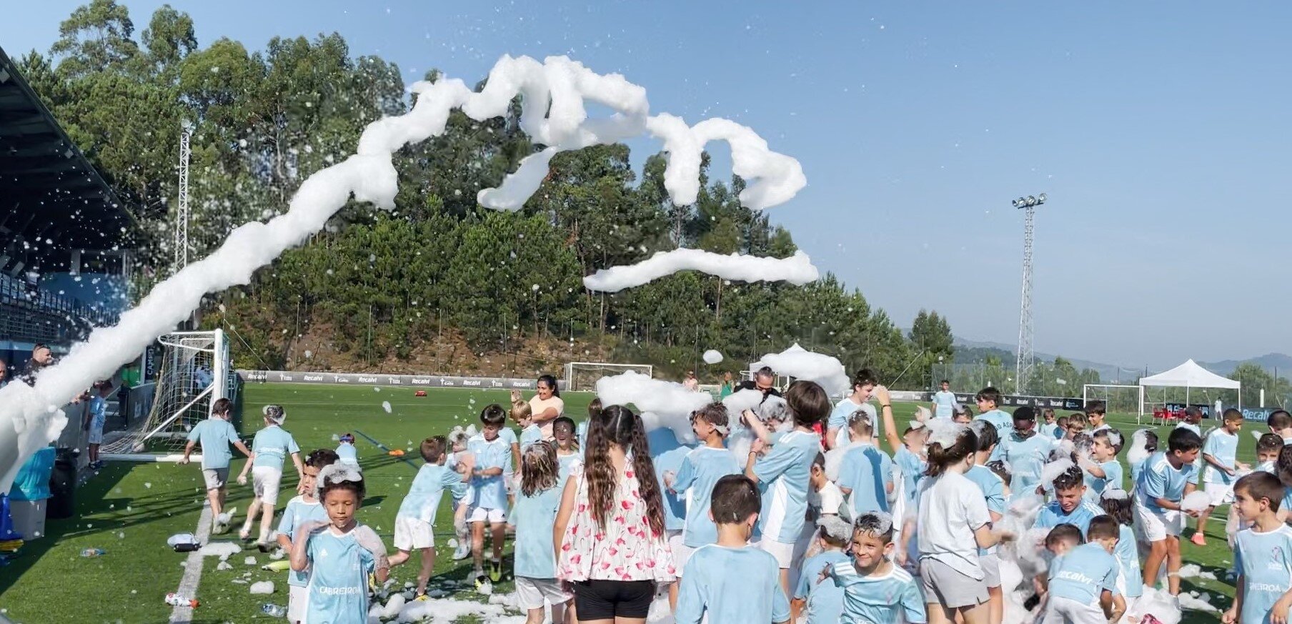 E doutra banda celebrouse a cerimonia de clausura curso 22-23 nas nosas instalacións principais da Madroa, ata alí chegaron todos os xogadores e familiares das diferentes sedes, reunindo máis de 150 xogadores. Puideron pasar unha tarde extraordinaria como moita diversión e sorpresas: campos de fútbol de diferentes dimensións, campos de tenis-pé, campos de tenis con pas, diferentes xogos de técnica e habilidade co balón, zona de tiro con lona de precisión, xogos de mesa… E unha área de atraccións con diferentes inchables e un jumper onde os xogadores gozaron ao grande. E cun servizo de xeados e cachorros para recuperar enerxías durante a tarde. Á cerimonia de clausura púxose fin cunha divertida festa da escuma onde tanto xogadores como pais pasaron un momento divertidísimo. Por último cada xogador recibiu un diploma conmemorativo do curso e un detalle de agasallo, e os máis afortunados con algún agasallo extra dos numerosos premios que se sortearon. Todos xuntos puxeron fin ao acto cunha foto de familia para o recordo e cantando o himno do RC Celta.