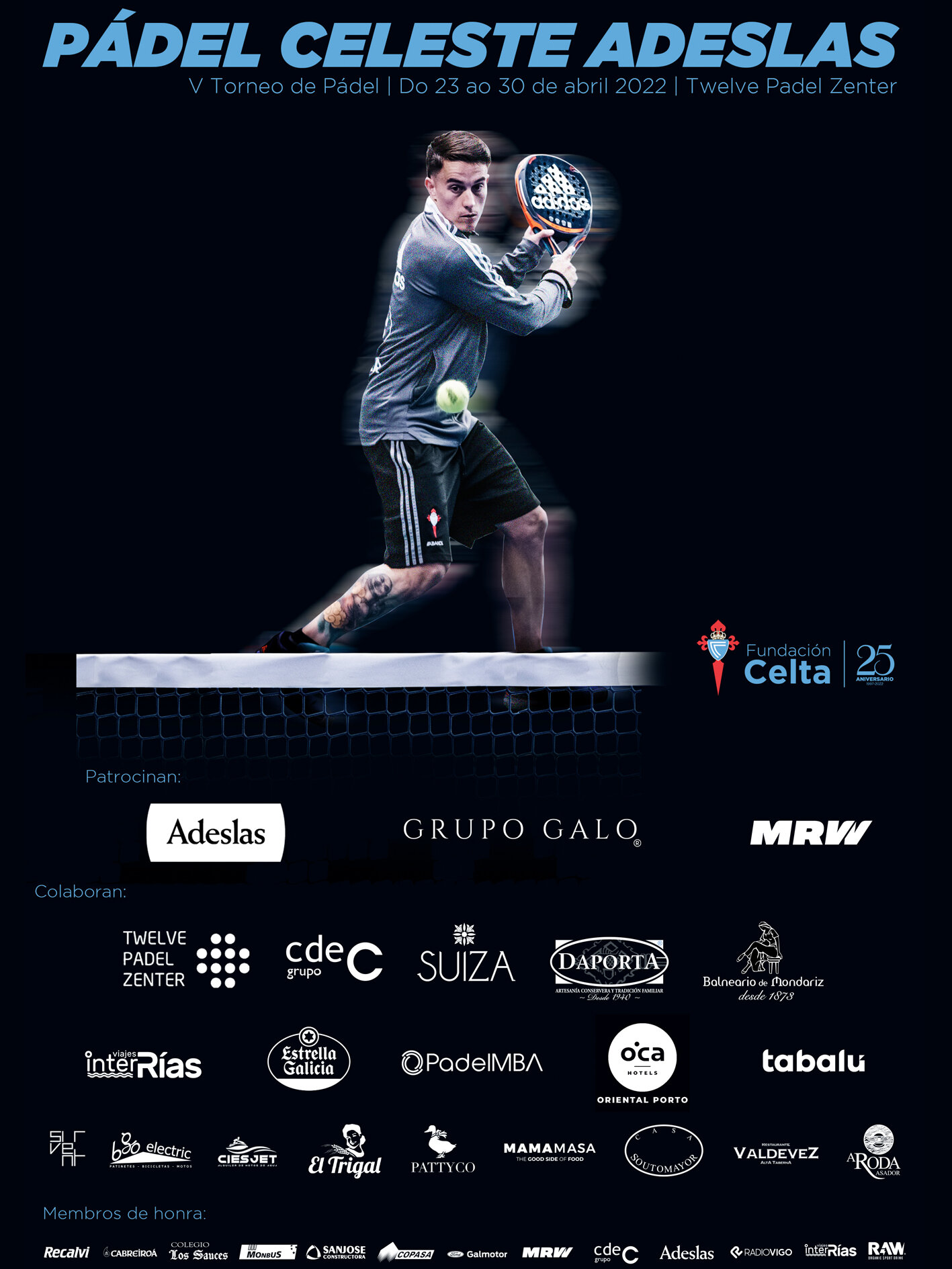 A Fundación Celta de Vigo presenta a sexta edición do torneo de PÁDEL CELESTE ADESLAS que terá lugar nas instalacións de Twelve Padel Zenter en Vigo entre o 14 e o 22 de abril de 2023. As inscricións efectuaranse a través de Ibertenis. com, sendo o límite do prazo de inscrición o luns 10 de abril ás 23:59 h. O sorteo realizarase o 11 de abril en Twelve Padel Zenter e as publicacións dos cadros pódense consultar na súa web ou en Ibertenis.