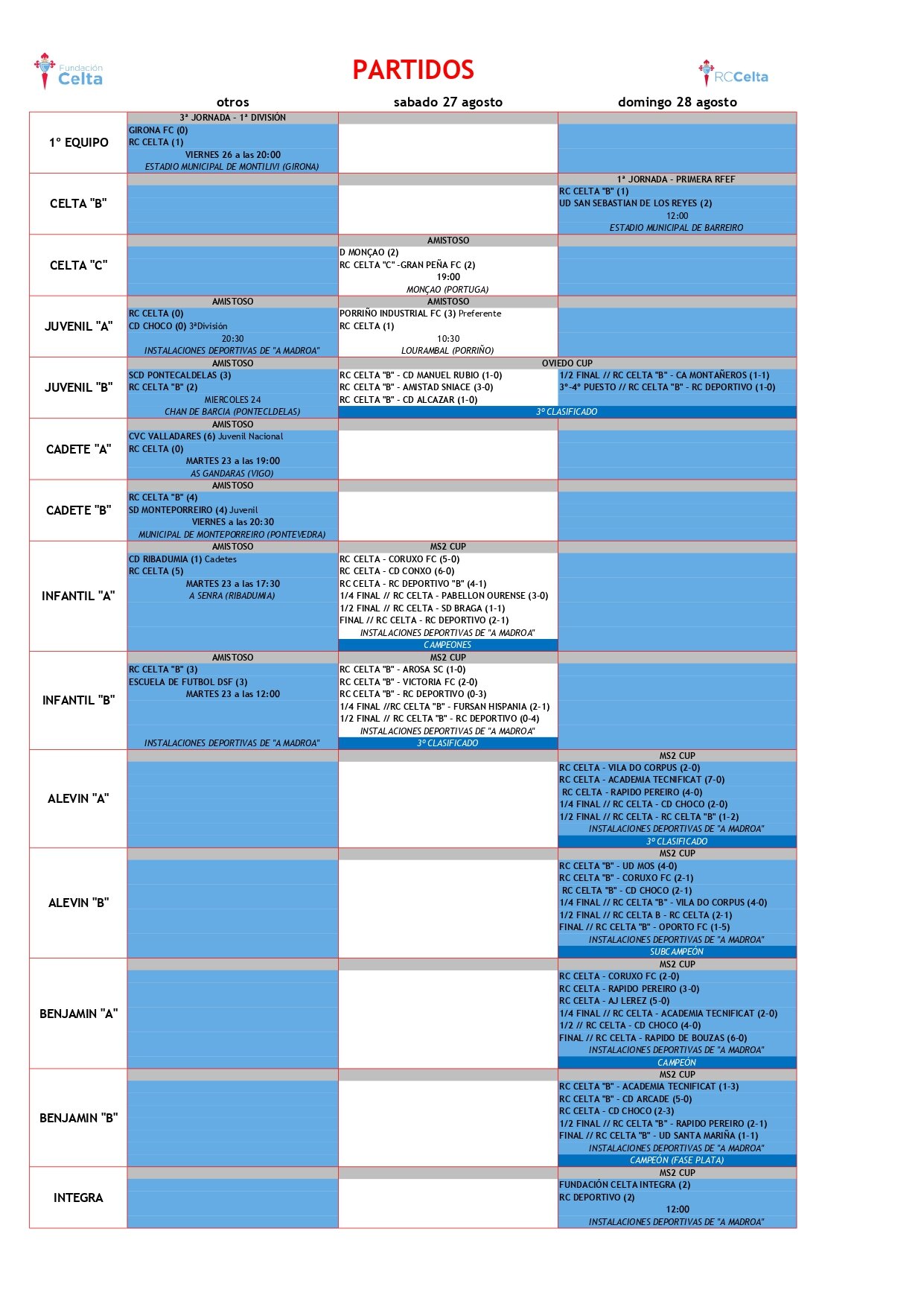 Resultados da canteira do RC Celta (27 e 28 de agosto)