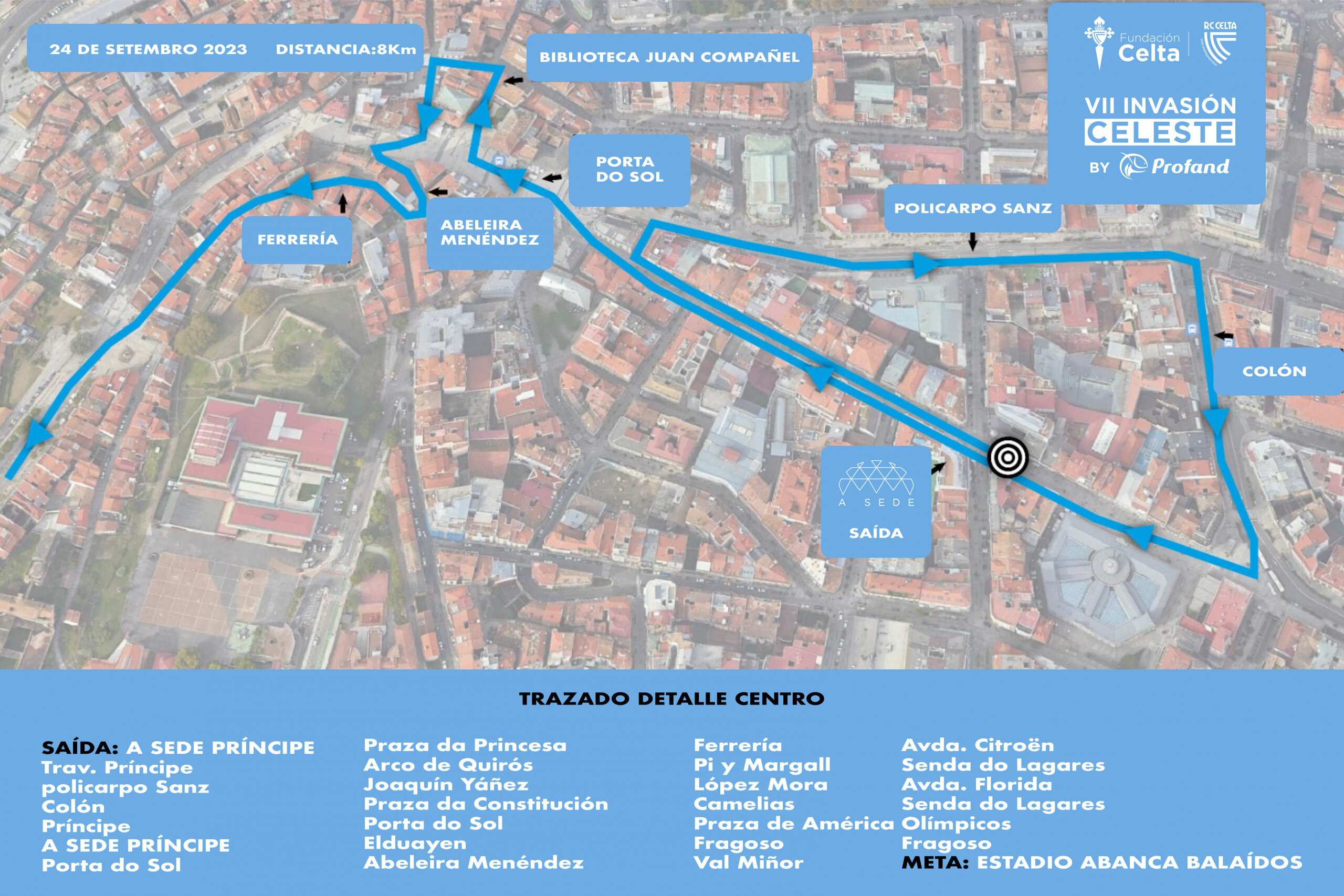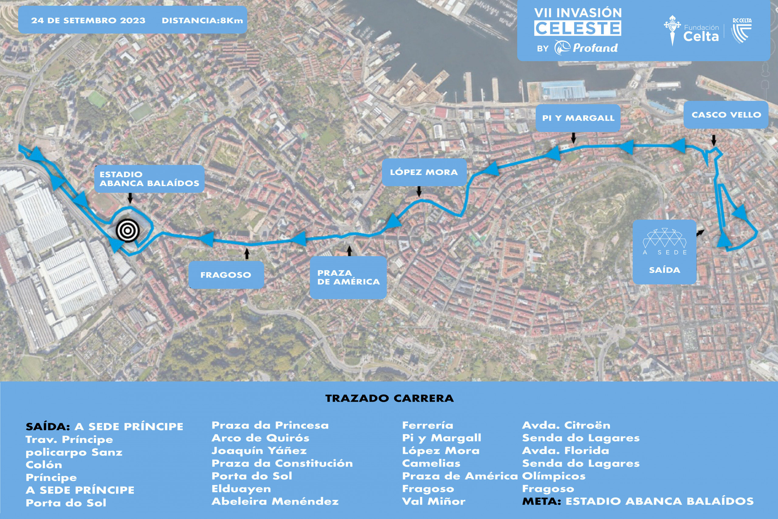 A liña de saída desta emocionante carreira será na Sede do RC Celta, en pleno centro da cidade olívica, e o percorrido estenderase ata terminar no Estadio Abanca Balaídos.